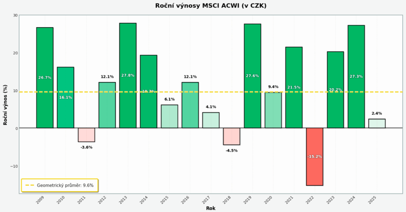 - Průměrný výnos (např. 10 % ročně) téměř nikdy nepřichází „průměrně“, ale jako mozaika velmi rozdílných roků.
