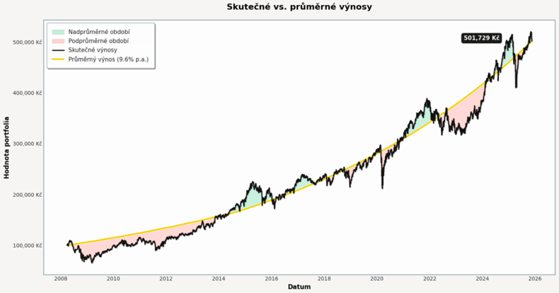 Pokud byste si během těchto 17 let průběžně počítali váš průměrný roční výnos, tak byste se k číslu 10 % moc často nedobrali (pouze ve chvílích, kdy se žlutá a černá křivka protnou). Vaše pocity a spokojenost s výnosem by tak skoro jistě záležely na tom, kdy zrovna byste své portfolio kontrolovali.