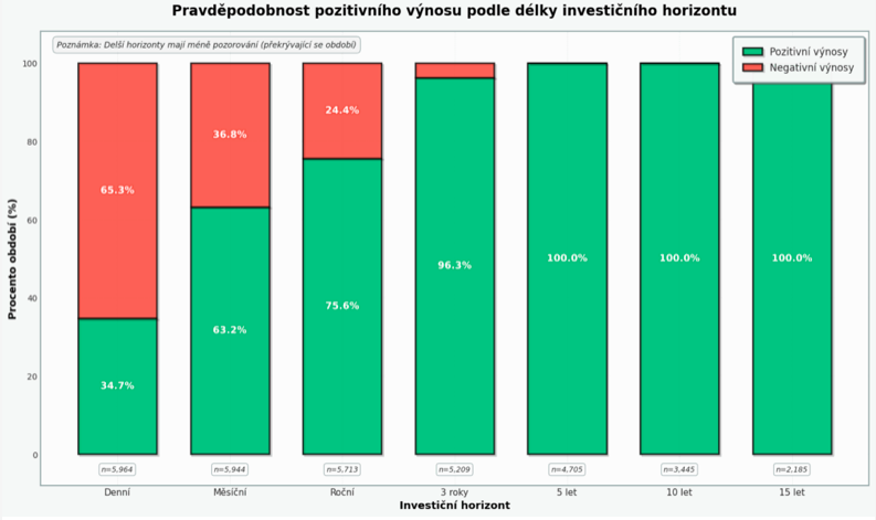 - Delší investiční horizont výrazně zvyšuje pravděpodobnost kladného výnosu a odměňuje tak trpělivost investora.